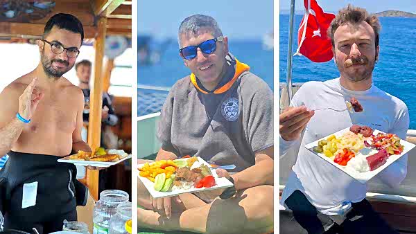 Dalış sonrasında teknede leziz ve doyurucu bir öğle yemeği sunulmaktadır. Menü günlük olarak değişmekte olup tüm misafirlerimizi memnun edecek şekilde özenle hazırlanmaktadır. Yemek molasının ardından: